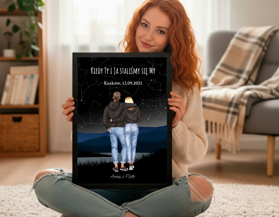 Personalizowany plakat para z mapą gwiazd – romantyczny obraz w ramie